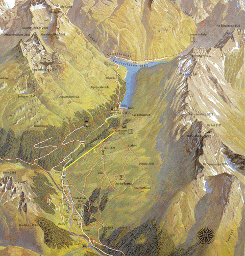Nach einer halbstündigen, kurvenreichen Busfahrt von Illanz erreicht der Besucher das Dorf Vals, das zuhinterst in der Surselva liegt. Der Weg führt an steilen Felswänden, Vegetation und Wasser vorbei.